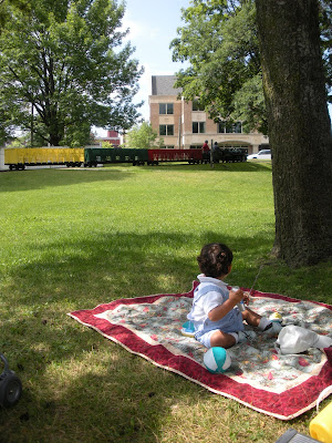 Sunday was a picture-perfect day. It began with a picnic breakfast on the Grand Traverse Bay, then a train ride for Blanden, then playtime on the beach (this time in the warm sunshine). We had wood-fired pizza and wine for lunch outside on the patio at Black Star Farms (where Uncle Andrew and Aunt Jill got married), and Blanden got to pet more farm animals (his face just lit up). Eventually we had dinner on another patio of a good restaurant, then took a walk around the park before we all finally crashed into bed. (Aunt Jill sent Daddy many photos throughout the day from her phone, so we took a break from blog posting last night. :) )