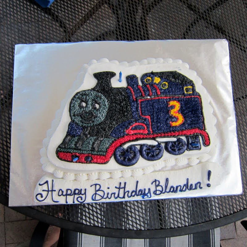 We had Indian tacos for dinner and a Thomas cake, chocolate (Blanden's pick) with strawberry filling, for dessert. Blanden was a little perplexed by the number #3 at first; after all, Thomas is #1.